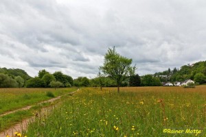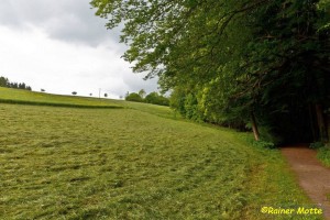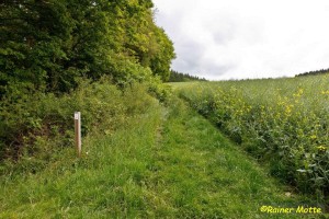 Schließlich führten die Wiesenwege meist durch hohes ungemähtes Gras. Bei Nässe ein unangenehmer Test, wie lange die Gore-Tex-Membranen der Schuhe wohl dicht halten. Ob es im hessischen Teil der Etappe wohl so etwas wie ein Wegemanagement gibt? Bei einem „Premium“-Wanderweg erwartet man besseres. Im rheinland-pfälzischen Teil war das Gras auf Wiesenwegen durchweg kurz gehalten, die Beschilderung vollständig und auch sonst alles tipptopp.