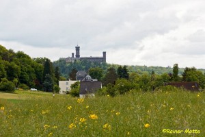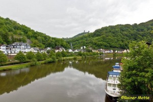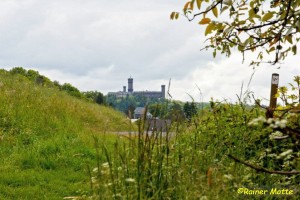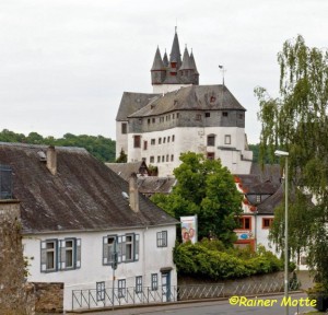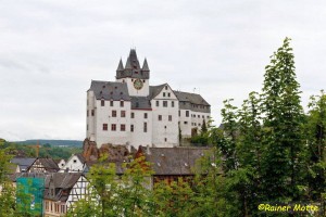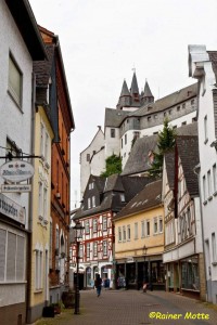 Klammen Fußes erreichte ich nach den endlos scheinenden Wiesen dann doch den Wald und schon bald einen Aussichtspunkt („Teufelskanzel“), von dem aus man leider nichts sah. Die unsichtbare Landesgrenze wurde überschritten und ich befand mich auf breiten Wegen im Diezer Stadtwald. In Diez fesselt mich neben ein paar Fachwerkhäusern natürlich vor allem die mächtige, ortsbildprägende Burg (Grafenschloß).