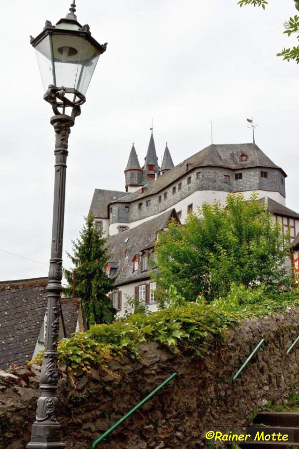 Klammen Fußes erreichte ich nach den endlos scheinenden Wiesen dann doch den Wald und schon bald einen Aussichtspunkt („Teufelskanzel“), von dem aus man leider nichts sah. Die unsichtbare Landesgrenze wurde überschritten und ich befand mich auf breiten Wegen im Diezer Stadtwald. In Diez fesselt mich neben ein paar Fachwerkhäusern natürlich vor allem die mächtige, ortsbildprägende Burg (Grafenschloß).