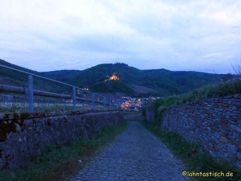 Die zweite Sonderschleife führt erneut über die Brücke in Bernkastel-Kues. Und durch die malerische Altstadt in der aber natürlich um halb zwei Uhr nachts die Bürgersteige schon hochgeklappt sind. Nach dieser Schleife sind viele Teilnehmer, so auch ich, der Meinung, dass diese Schleife total schön ist und Spaß macht. Na ja, es geht zuerst einmal 3 – 4 km ziemlich steil bergauf. Immer durch einen urigen Wald. Leider gelingen mir hier keine guten Bilder. Aber oben angekommen bestätigt mir ein Helfer des DRK, dass man hier wunderschön wandern kann und gute Aussicht hat. „Bei Tag“, schiebt er noch schnell hinterher. Na klar, wer turnt hier schon mitten in der Nacht herum?