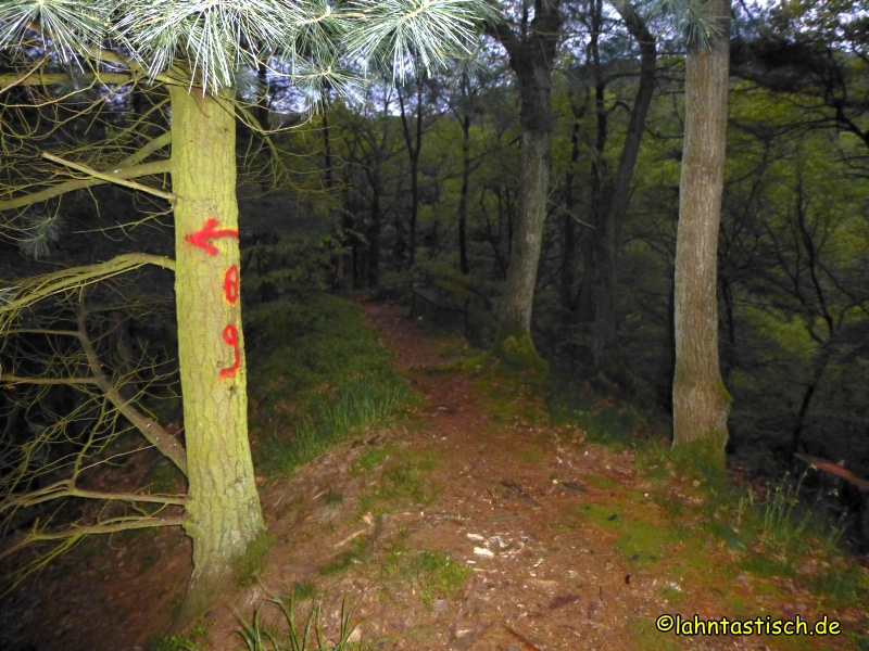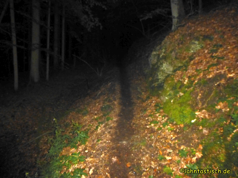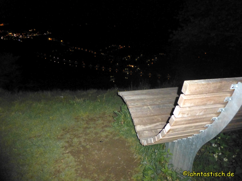 Oberhalb der Weinberge wandern wir jetzt durch den Wald. Einen Aussichtspunkt mit „Relaxliege“ erkenne ich nur schemenhaft. Unten im Tal die Lichter von Bernkastel-Kues. Idyllisch, aber mir bleibt ja keine Zeit zum Verweilen. Ich gehe weiter. Irgendwo lärmt Musik. An einer Grillhütte Ist eine Party im Gange. Die Jugendlichen scheinen sich über die Abwechslung zu freuen als wir Wanderer vorüber ziehen. Ich werde auf ein Bier und ein Steak eingeladen aber lehne dankend ab. Wenn ich jetzt ein Bier trinke, dann wird das nix mehr mit der zweiten Sonderschleife. Wie Ihr bemerkt, ist inzwischen mein Entschluss gereift, die 80 km komplett zu bewältigen.