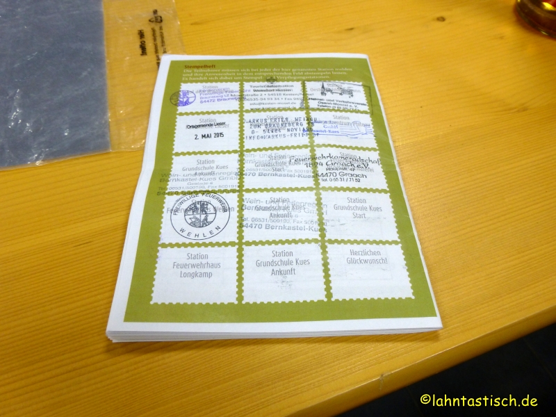 Dann aber geht es bergauf. In Serpentinen folgen wir dem Moselhöhenweg bis wir dann eine Ebene höher die Hütte auf dem Brauneberg erreichen. Hier gibt es neben dem Stempel noch einen Erlebnis Infostand „Grafen, Gold und Schwarzer Peter“. Außerdem werden wir mit leckerem Walnussbrot verköstigt. Sehr schön, auch wenn die Schlange an der Stempelstelle recht lang war.