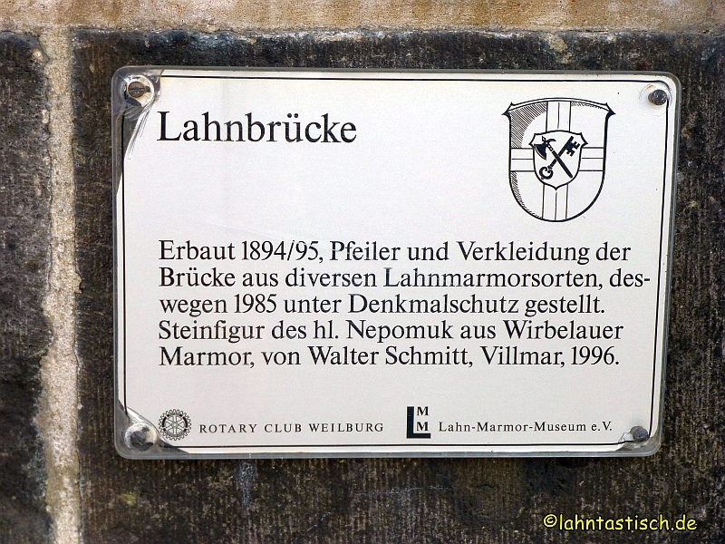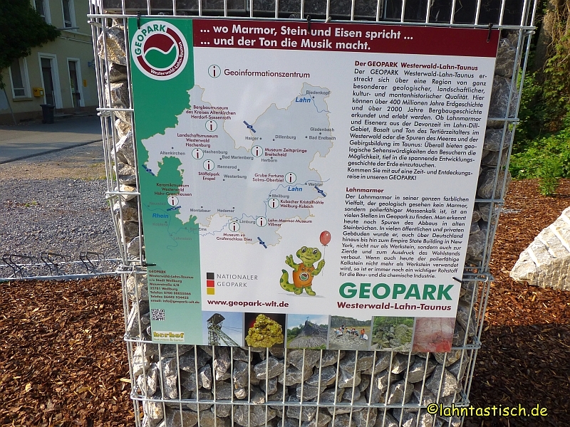 Dann überquere ich abermals die Straße, steige wieder hinauf… am Friedenskreuz vorbei geht es in Richtung Villmar. Vor Villmar geht der Weg in Richtung Lahn hinunter, an dieser entlang und über die Brücke. Die Bedeutung des Lahnmarmors für Villmar spürt man hier an jeder Ecke. Ihr solltet unbedingt Zeit einplanen um das Naturdenkmal Unica (Marmorbruch) und, wenn es denn dann eröffnet ist, natürlich auch das Lahn-Marmor-Museum zu besuchen.