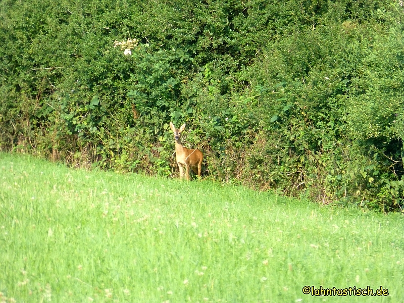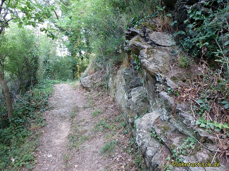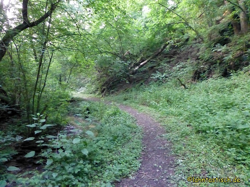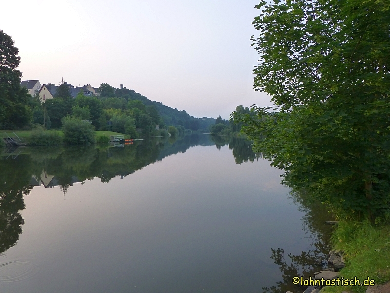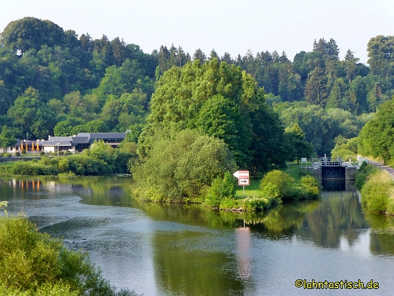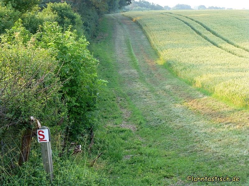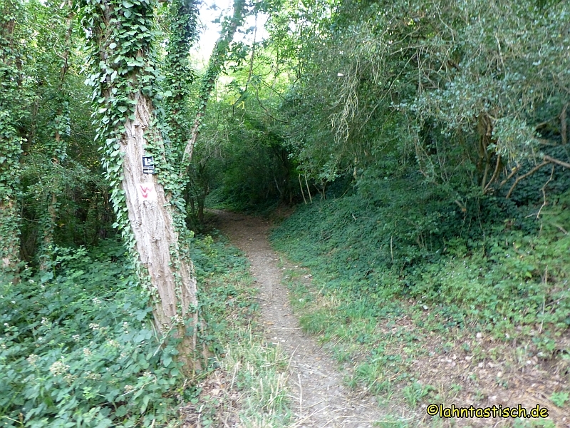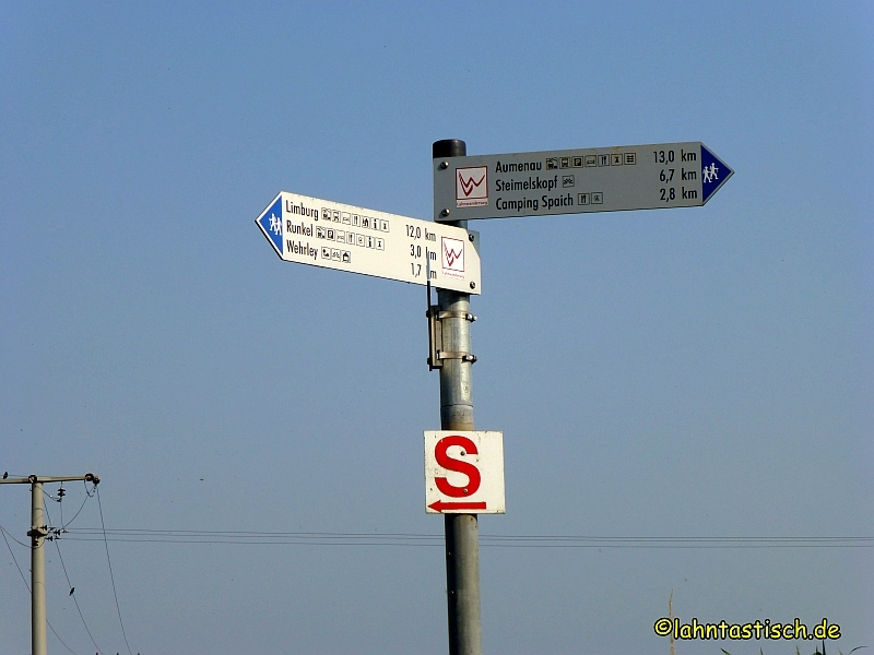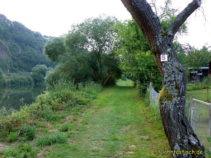 Da es sich um einen Rundweg handelt,  empfiehlt sich der Start sowohl in Villmar als auch in Runkel. Auch die Richtung kann man frei wählen und jede Wahl hat ihren Reiz. Ich habe mich entschieden in Runkel zu starten und entgegen des Uhrzeigersinnes zu gehen. An der sehr empfehlenswerten Eisdiele Manusco vorbei wandere ich nun fast einen Kilometer am Lahnufer entlang. Da ich mich früh morgens auf den Weg gemacht habe um der Hitze zu entfliehen ist es noch herrlich ruhig und frisch. Dann überquere ich die Landesstraße und folge der Ausschilderung (Rotes S auf weißem Grund).