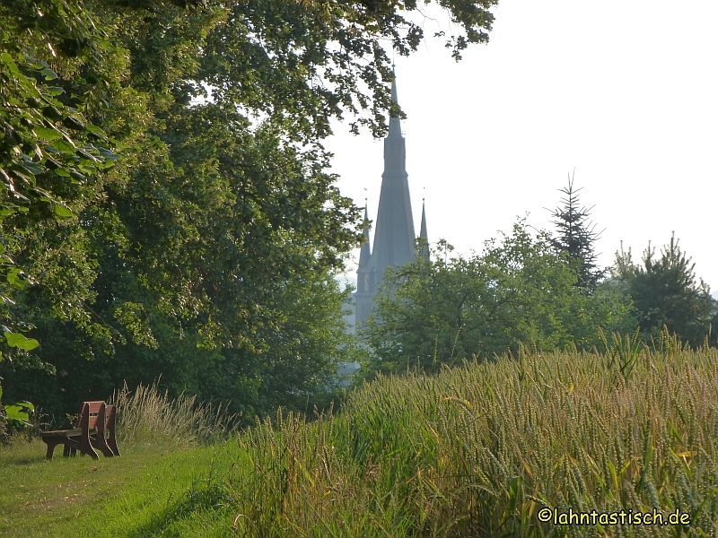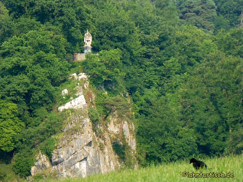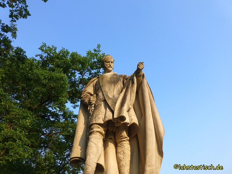 Durch ein Waldstück geht es sachte aber stetig bergan bis ich an einer Bank die erste schöne Aussicht in Richtung Villmar habe! Leider ist in diesem Bereich die Ausschilderung nicht mehr komplett und so orientiere ich mich an den Wegmarkierungen des Lahnhöhenweges (Links der Lahn). Ich steige hinab in das Tal des Arnsbaches. Ein idyllischer und sehr naturnaher Abschnitt des Weges. Natürlich geht es dann irgendwann wieder bergauf, immer am Waldrand entlang. Schließlich führt der Weg dann hinunter, wieder über die Landesstraße und zum König-Konrad-Denkmal an der Bodensteinerlai. Den kurzen Abstecher zum Denkmal sollte man unbedingt machen. Lohnt sich.