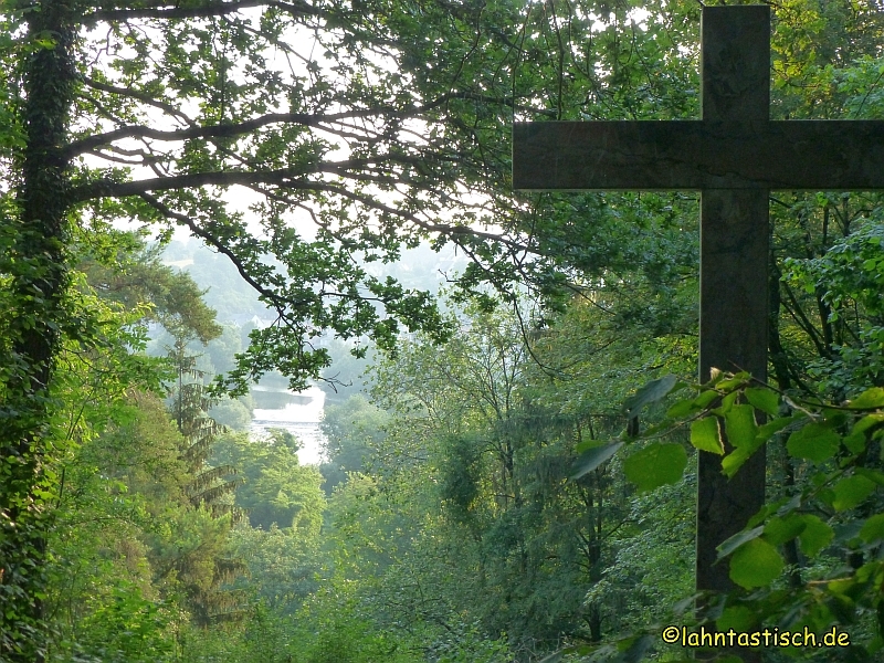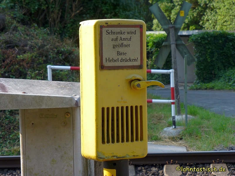 Nun wandere ich auf der anderen Seite der Lahn entlang. Ich befinde ich mich auf dem Zubringer des Lahnwanderweges welchen ich dann bis Runkel nicht mehr verlassen muss. Ich überquere die Bahnlinie an einem beschrankten Bahnübergang. Dafür muss ich den Schalter des Automaten betätigen und meinen Wunsch kundtun. Der freundliche Bahnbedienstete öffnet mir und wünscht mir einen guten Tag. Das ist bestimmt auch für Kinder ein Erlebnis. Nachdem ich nochmals die Aussicht auf das König-Konrad-Denkmal genossen habe, wandere ich am Naturdenkmal Ibacheiche vorbei hinauf zum Lahnwanderwegs. Kurze Zeit später eröffnet sich mir ein Postkartenblick auf die Lahn, den Lahnradweg, die Bahnstrecke und das gegenüber liegende König-Konrad-Denkmal! Hier lässt es sich aushalten, die Bank lädt zum Verweilen ein.