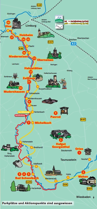 Auf einer Strecke von 63,5 km kann das Aartal an zahlreichen Aktions- und Erlebnisstationen erkundet werden. Ob Draisinenfahrt, Hoffest, Burgführung, Museum, Radeln oder geführte Wanderung. Da müsste doch für jeden etwas dabei sein. Besondere Highlights in diesem Jahr sind das Römerfest am Limesturm in Taunusstein-Orlen, das Keltenfest im Hotel Hofgut Georgenthal und Führungen zum Sanierungskonzept „Hessische Landesgartenschau 2018“ in Bad Schwalbach.