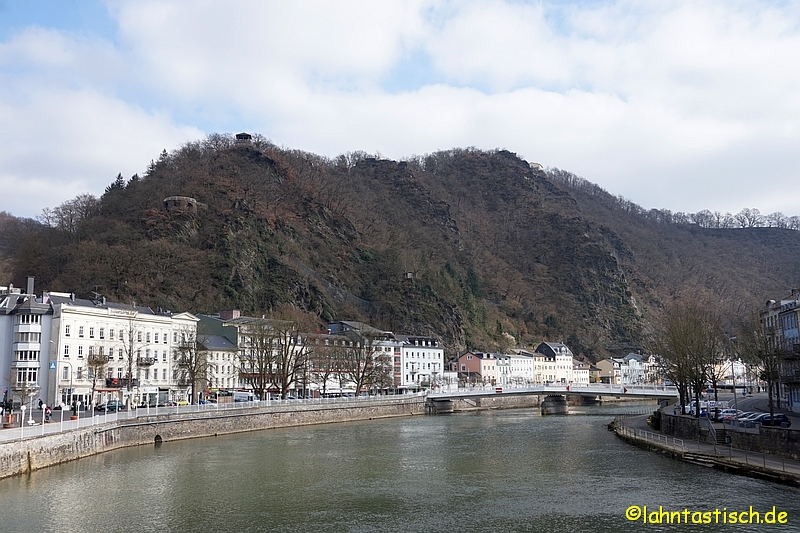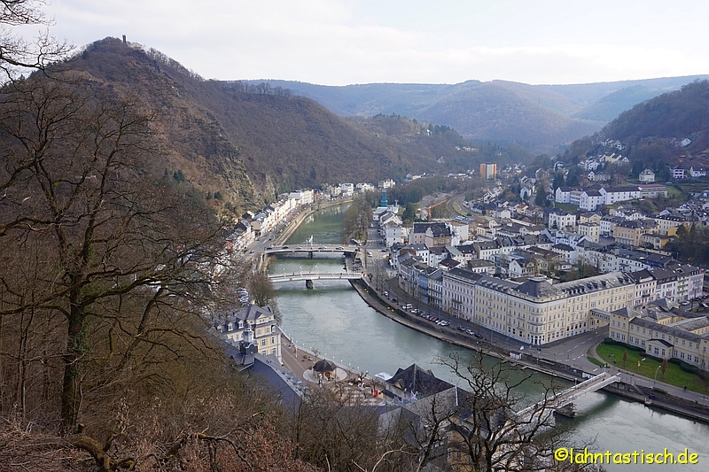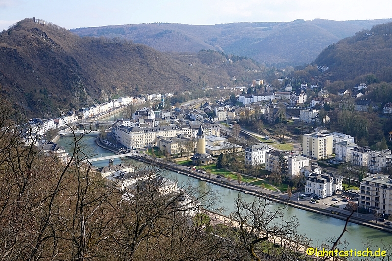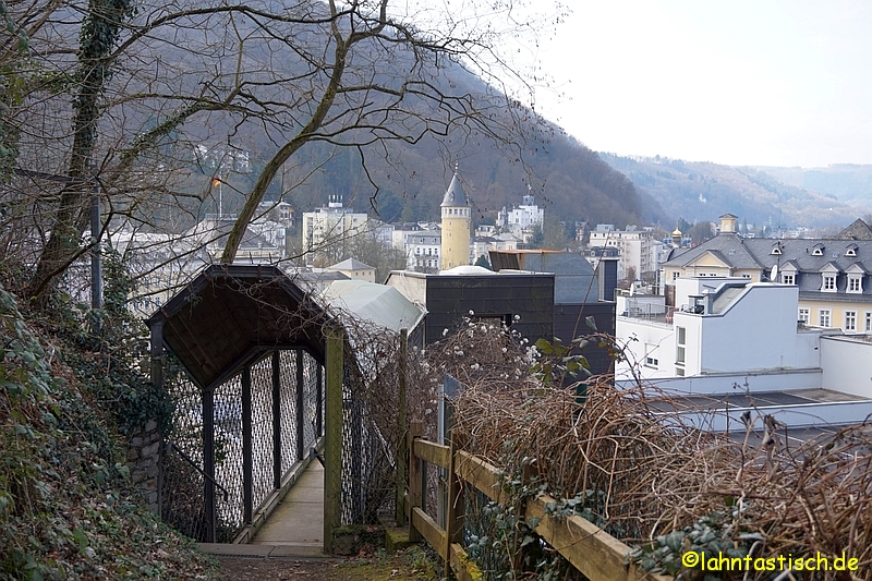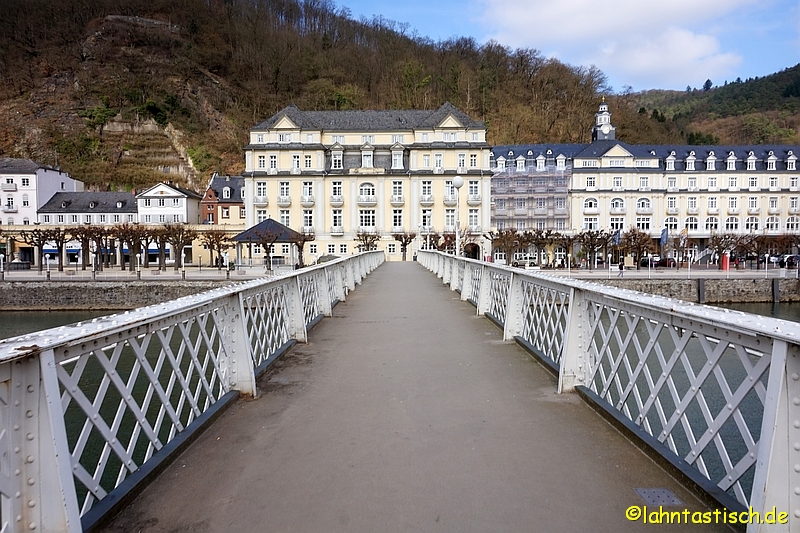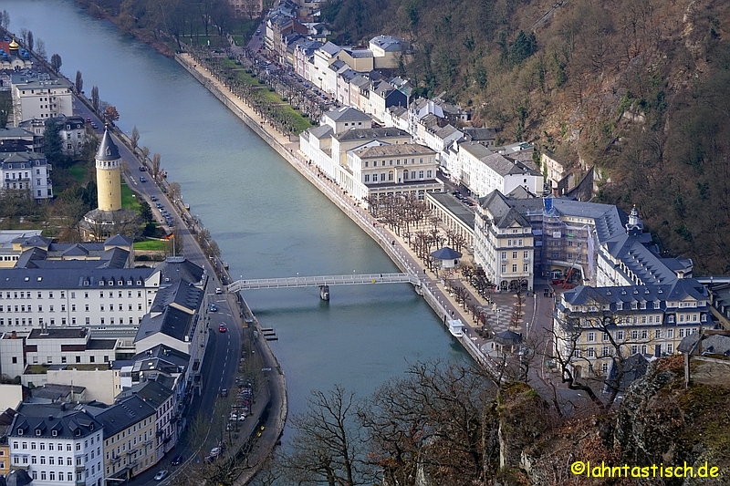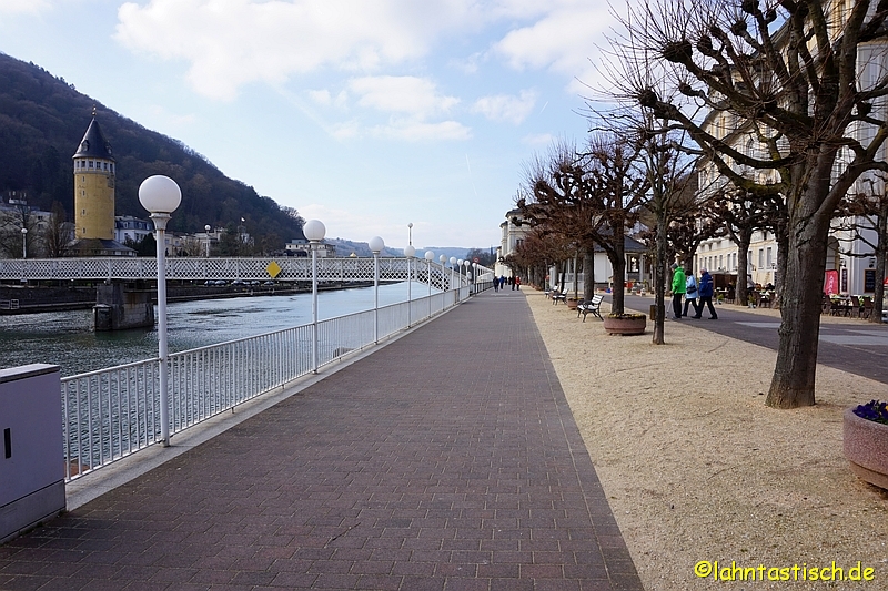 Auch was nun folgt, ist wohl ziemlich einmalig in Deutschland – drei Wanderwege führen durch ein… Parkhaus! Zumindest die Parkhaustreppe hinunter. Nun sind wir mitten in Bad Ems. Wir machen einen kleinen Abstecher vom Premiumweg, genießen die Sonne auf der Lahnuferpromenade und das fast schon maritime Flair der Stadt.
