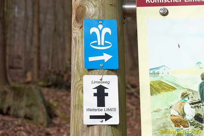 Zum zweiten mal unterqueren wir die Kurwaldbahn. Mit ihr wären wir sicherlich schneller oben am Bismarckturm gewesen ;-) Wir streifen den Kurpark und gelangen schließlich wieder in den Wald. Entlang des Limeswanderweges wanderen wir Kemmenau entgegen, lassen uns von ein paar Schautafeln zur römisch-germanischen Geschichte und weiteren Geocaches ablenken, und überqueren schließlich die „Alte Kemmenauer Straße“.