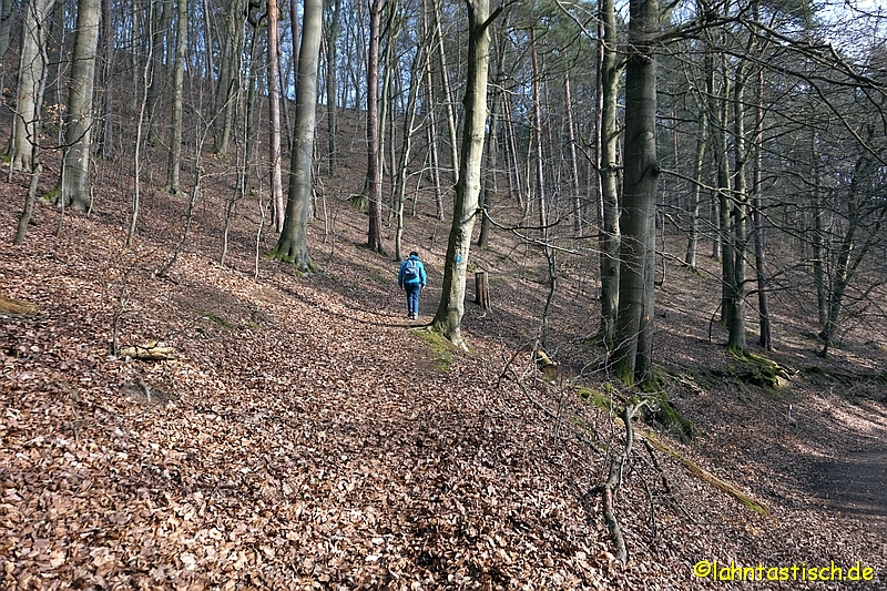 Bislang sind wir überwiegend bergab gelaufen und uns ist klar, dass nun ein nicht unanstrengender Anstieg folgt. Wir verlassen den Lahnwanderweg und folgen der Beschilderung des Premiumweges Höhenluft hinauf zur römischen Limespalisade. Die Römer werden uns ab jetzt öfters begegnen, denn unser Weg ist zum Teil identisch mit dem Limeswanderweg. Aber zunächst einmal gibt es noch ein paar schöne Aussichten unterhalb des Bismarckturmes zu genießen. Eine davon, die Margaretenhöhe, hätten wir wohl nicht angesteuert wenn dort nicht ein weiterer Geocache gelegen hätte. Und wir hätten tatsächlich was verpasst!