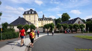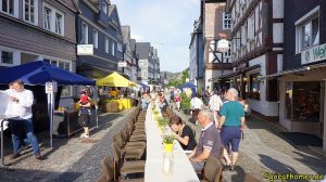 Immer dabei, wie auch schon in Nassau, der rote Riesenrucksack des Lahnwanderweges. Dieser wurde dann vom Schloss Wittgenstein hinunter zur längsten Schlemmertafel Wittgensteins getragen. Dort wurden die Wanderer mit Sekt empfangen! Die Schlemmertafel war sehr gut  besucht und das kulinarische Angebot riesengroß.