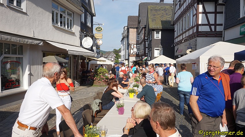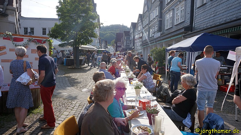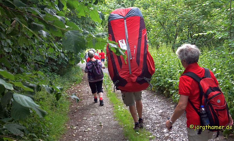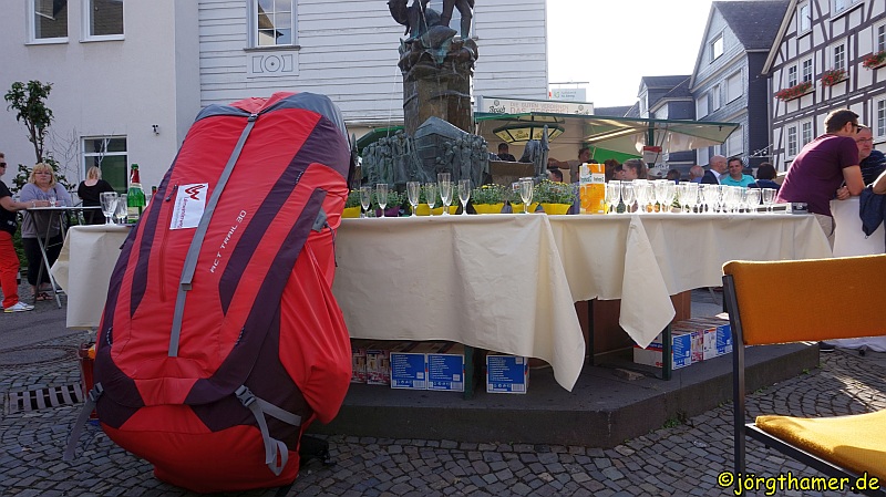 Immer dabei, wie auch schon in Nassau, der rote Riesenrucksack des Lahnwanderweges. Dieser wurde dann vom Schloss Wittgenstein hinunter zur längsten Schlemmertafel Wittgensteins getragen. Dort wurden die Wanderer mit Sekt empfangen! Die Schlemmertafel war sehr gut  besucht und das kulinarische Angebot riesengroß.