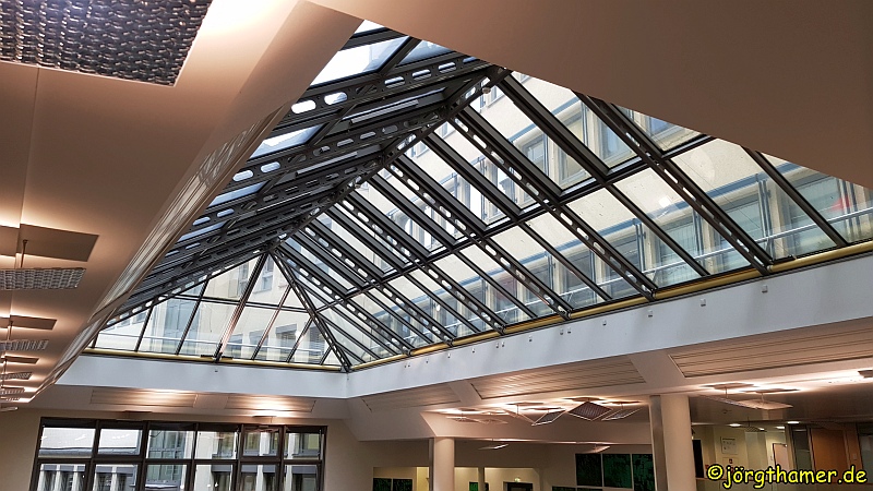 Dieser Rundgang beginnt vor der Tür. Oliver Schrangs hat den Bau des Gebäudes hautnah miterlebt und kann so manche Geschichte erzählen. Dann geht es mit dem gläsernen Aufzug ganz nach oben. Was folgt, ist ein durchaus eindrucksvoller Gang durch die verschiedenen Etagen des Gebäudes. „Sogar bei den Teppichen hat man sich Mühe gegeben“ erklärt Oliver Schrangs – je weiter oben man sich befindet, umso ruhiger ist die Musterung des Bodenbelages. Mit seinen vielen Glaselementen symbolisiert das Gebäude der KSK für was das Unternehmen steht: Offenheit und Transparenz.